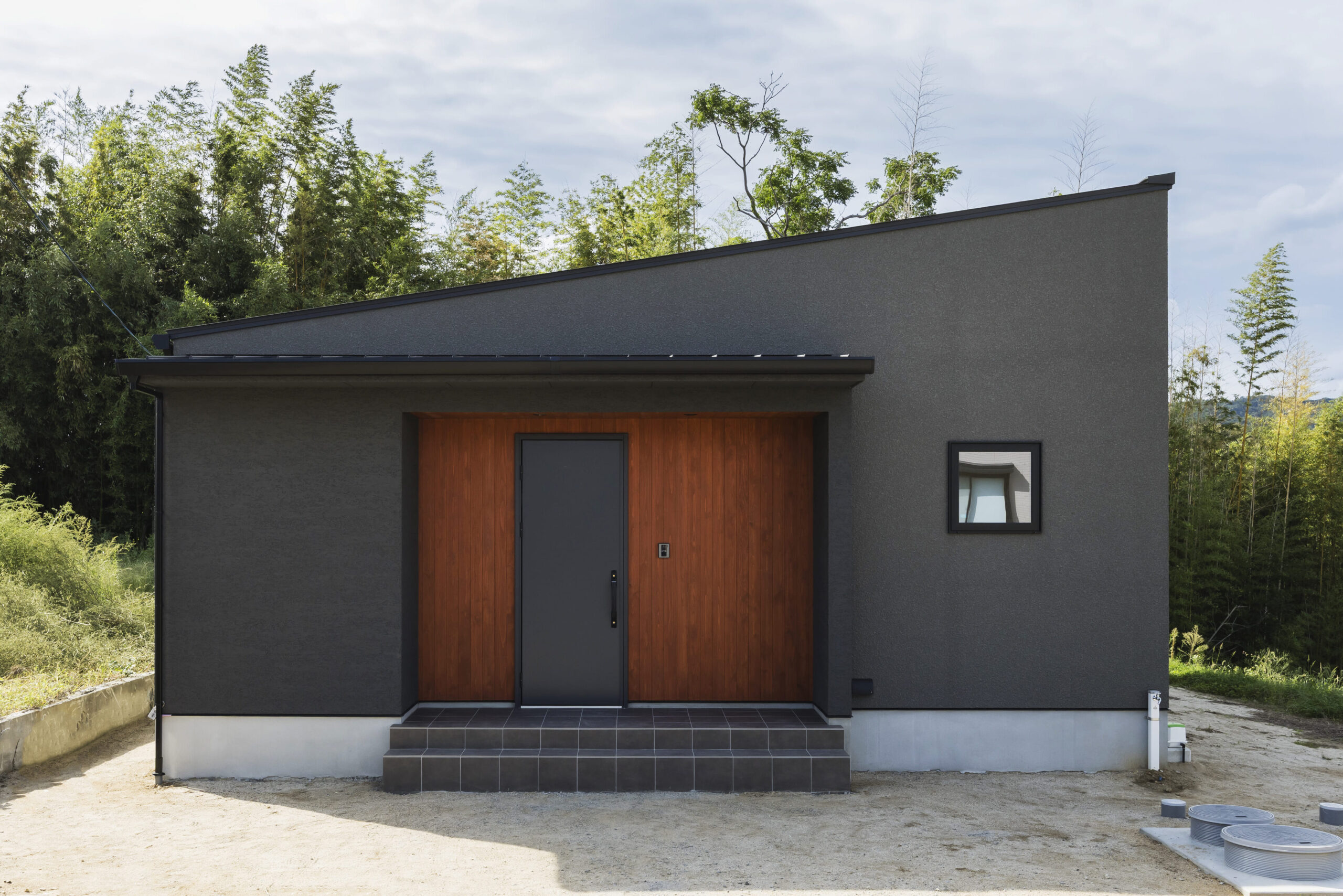 落ち着いたグレーの外壁に、木の温もりを感じさせる板張りをアクセントとしてプラス。自然と調和しながらも、モダンで洗練された印象を与えます。