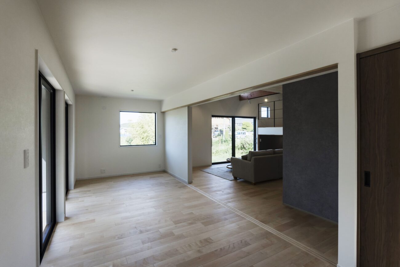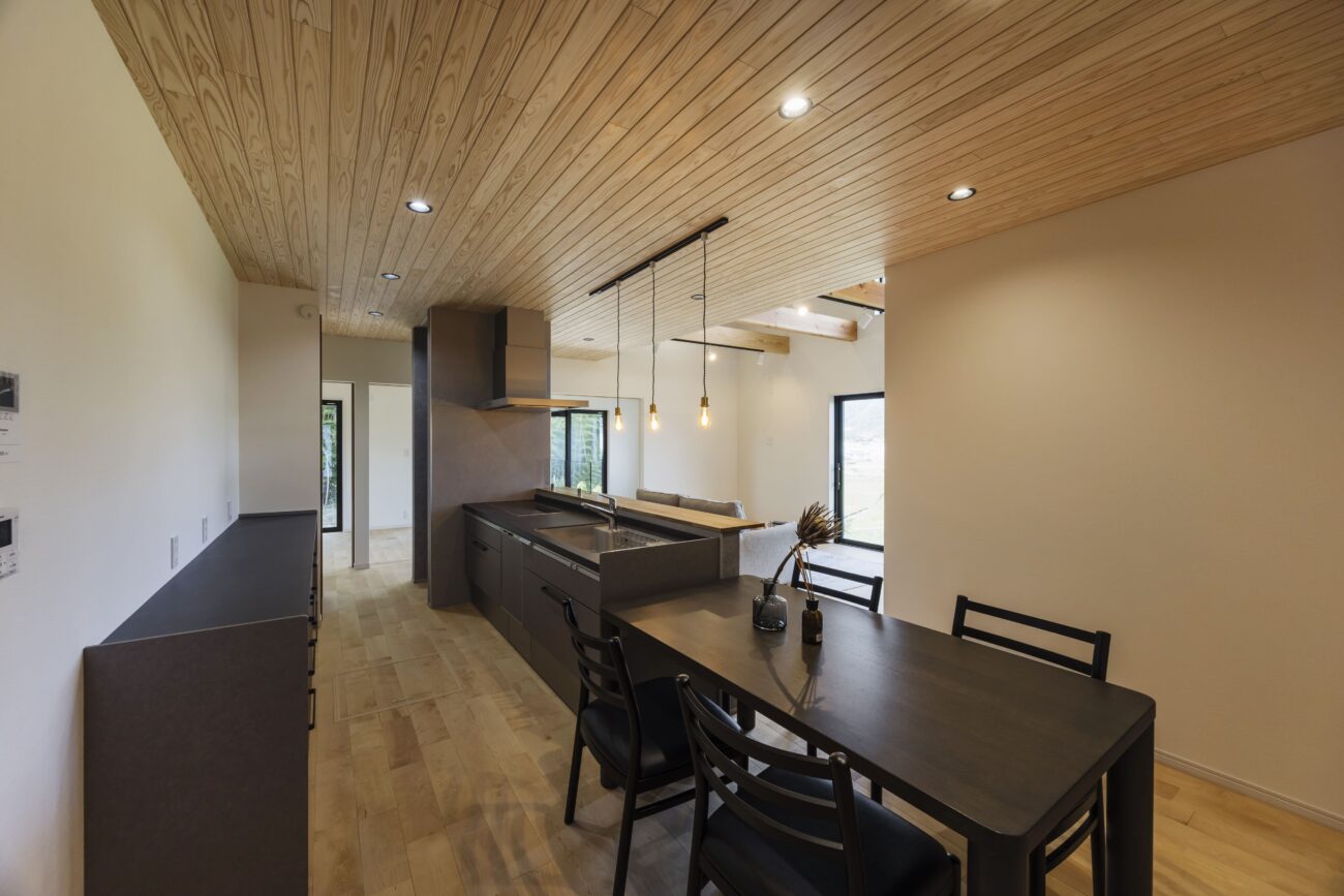 大きな窓からは、「先山」のパノラマビューが広がり、まるで絵画のよう。吹き抜けの天井には杉板を張り、木の温もりが感じられる心地よい空間に仕上げました。